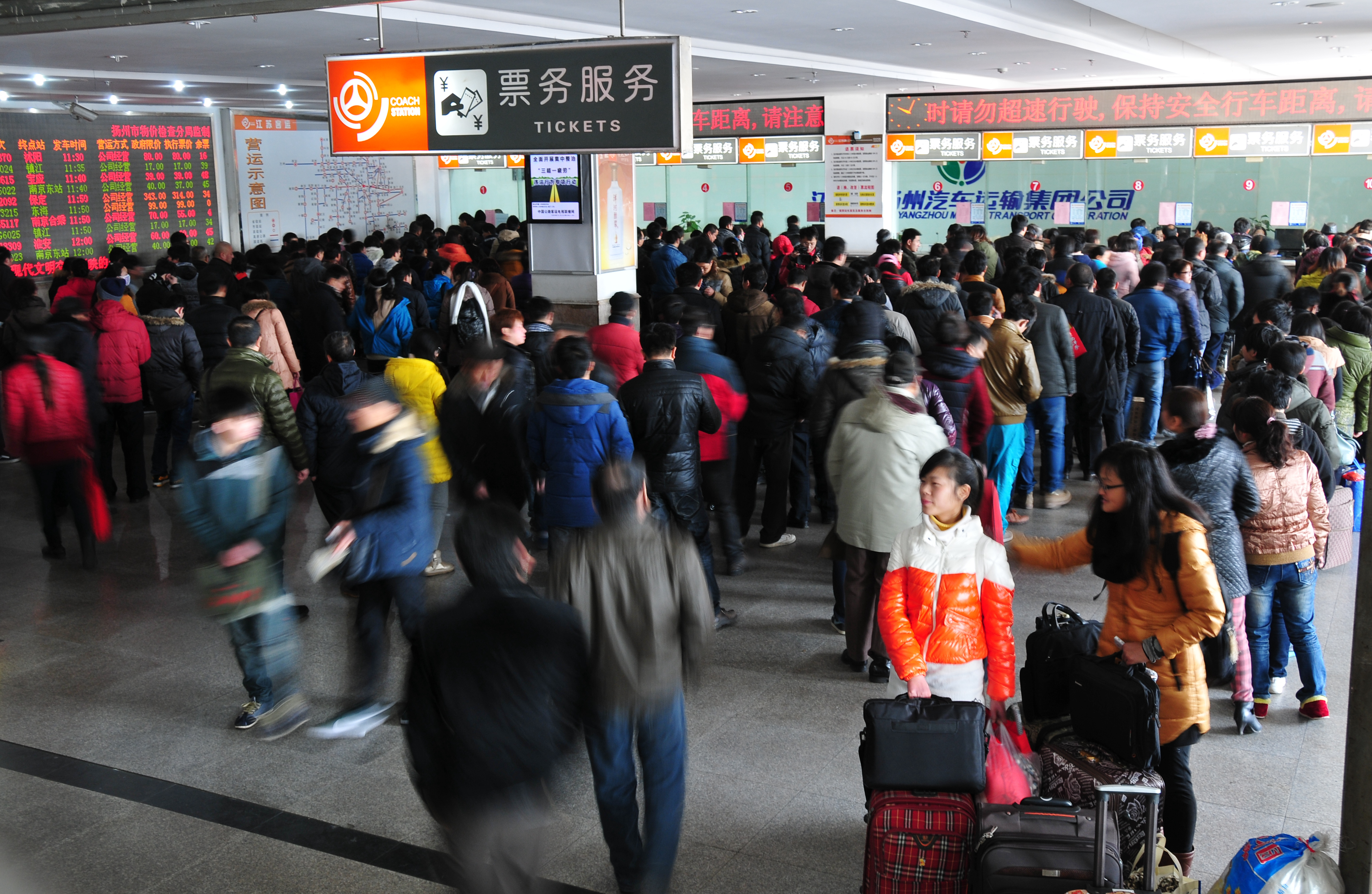 為應(yīng)對(duì)旅客購(gòu)票高峰壓力,揚(yáng)州汽車站打開了10個(gè)售票窗口,汽車東站打開了7個(gè)售票窗口,另外還使用了自助售票機(jī)、配備了退票專窗、手機(jī)換取票專窗。為方便民工返鄉(xiāng),車站還主動(dòng)聯(lián)系揚(yáng)州晚報(bào)推出“民工返鄉(xiāng)直通車”,集中為市區(qū)周邊廠礦工地的民工兄弟團(tuán)體預(yù)訂了近萬(wàn)張汽車票。