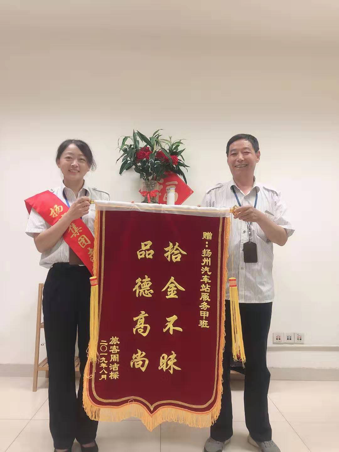 8月2號,杭州的周女士和同伴乘坐大巴車來揚(yáng)州游玩。不慎將裝有蘋果手機(jī)和錢包的手提袋遺忘在廁所的掛鉤上。后在揚(yáng)州汽車站服務(wù)班工作人員的幫助下,尋找到了失物。8月6日,已經(jīng)回到杭州的周女士特地郵寄來了錦旗,感謝揚(yáng)州汽車站服務(wù)班組工作人員。