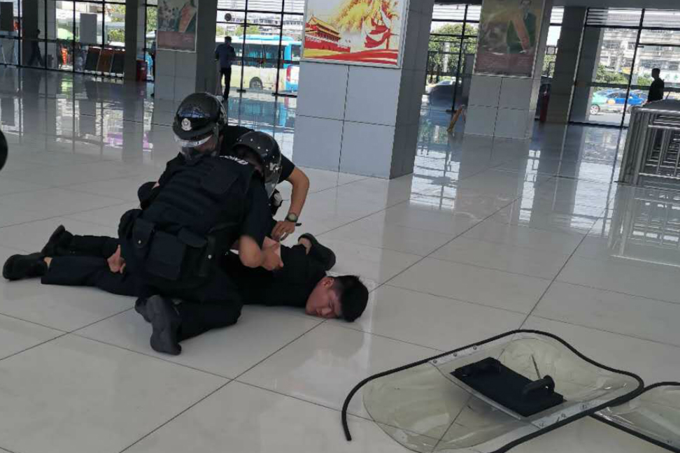 本次演練主要針對人員密集場所犯罪分子持刀砍殺旅客的警情進(jìn)行模擬。一名“黑衣男子”因生活受挫報復(fù)社會,在江都客運(yùn)站售票大廳內(nèi)持刀砍殺旅客。車站工作人員立即疏散旅客,利用110聯(lián)動中心緊急聯(lián)系警方。當(dāng)接到報警后,110指揮中心立即發(fā)出指令,要求江都區(qū)特警大隊、刑警大隊、交警大隊以及新區(qū)派出所人員攜帶裝備迅速趕到客運(yùn)站展開抓捕工作。警方將“嫌疑人”有效隔離后,迅速利用盾牌、鋼叉、抓捕器等防護(hù)武器將其制服。