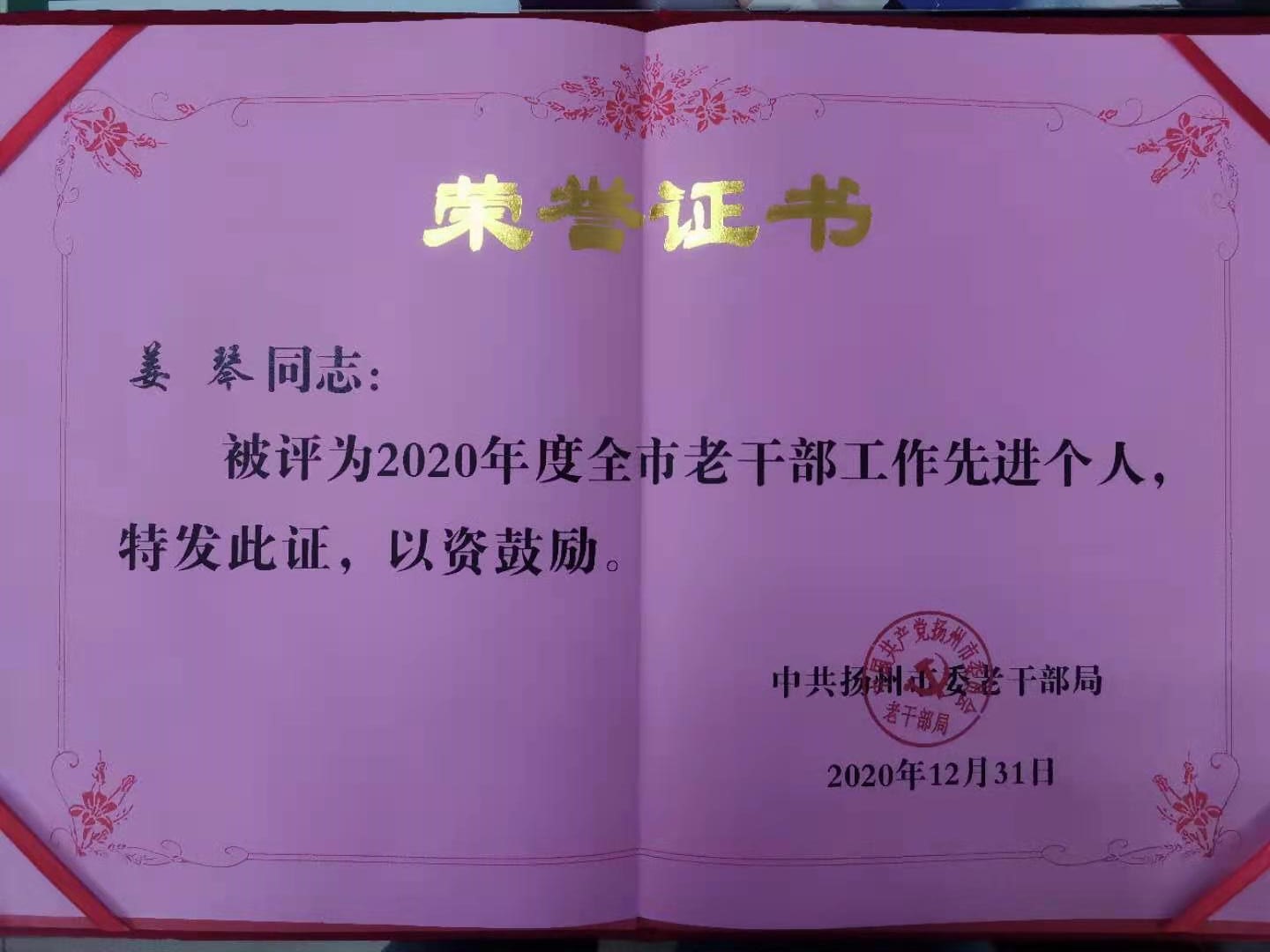 姜琴同志獲“2020年度全市老干部工作先進個人”稱號